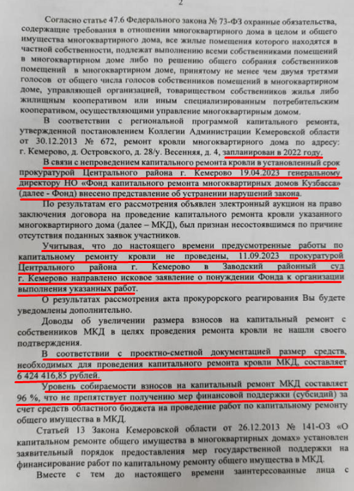 Самый простой способ решить проблему - не признавать, что проблема есть. Любимая уловка чиновников. Уже не первый год в Кемерово продолжается борьба жителей дома по ул. Островского 28 за ремонт кровли. Мы об этом писали неоднократно, дом признали объектом культурного наследия, смету выкатили на ремонт такую, что денег не хватает. Проект делала специализированная организация. Администрация Кузбасса открестилась, говорят денег у нас не спрашивали, мы и не выделяли. Администрация Кемерово - то же самое. Плановые накопления жителей дома составляют порядка 8 миллионов, ремонт 17 миллионов, если верить письму Фонда капитального ремонта. Прокуратура считает, что на ремонт надо 6 миллионов. А теперь новый ответ органов прокуратуры, оказывается и кровля тут ни причем, так как она не имеет отношения к объекту культурного наследия. Вспомним немного